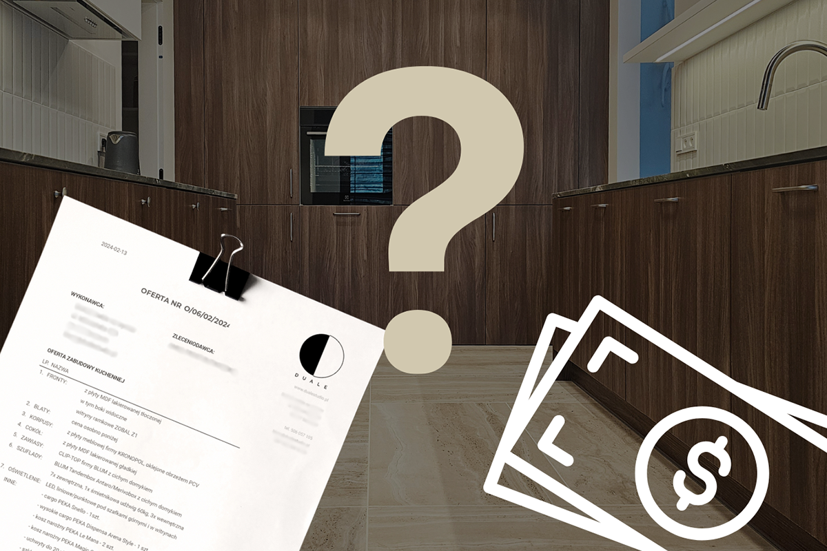 Załóżmy, że wybrałaś stolarza do swojej kuchni, jest to osoba z polecenia. Uważasz, że nie potrzebujesz szukać innego fachowca, bo ten jest dobry i sprawdzony. Wysyłasz mu projekt do wyceny, bądź robicie go razem, czekasz kilka dni, otrzymujesz ofertę i wyrywa Cię z butów ?