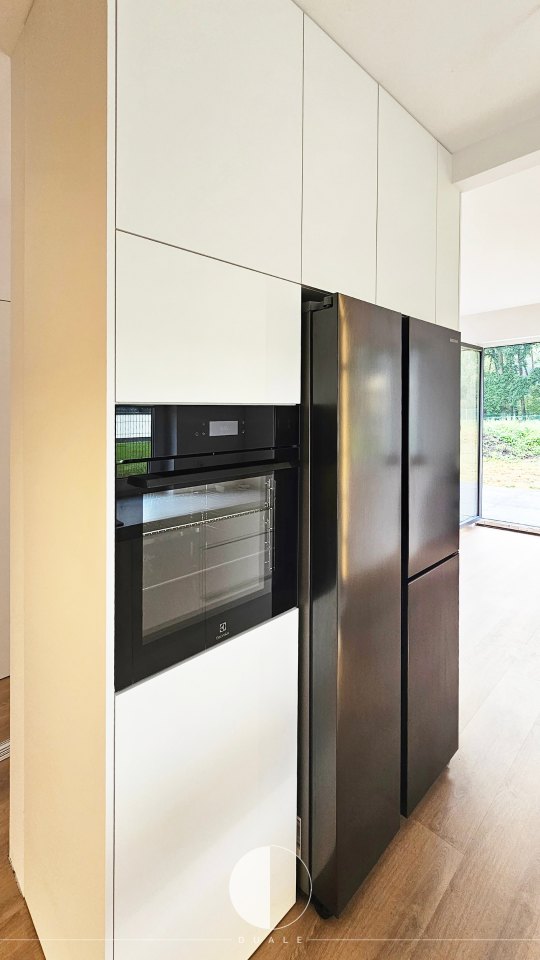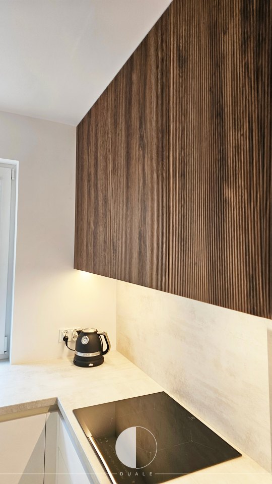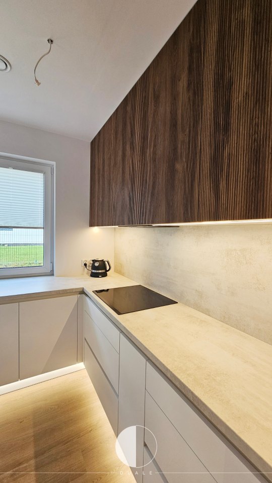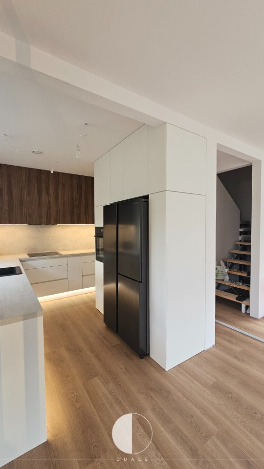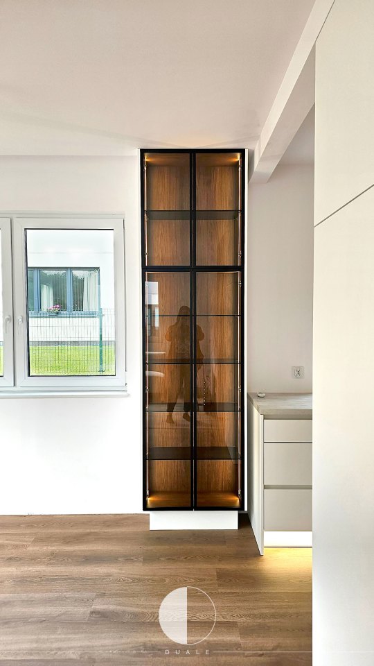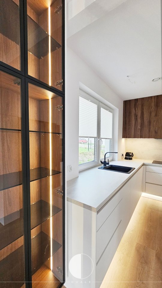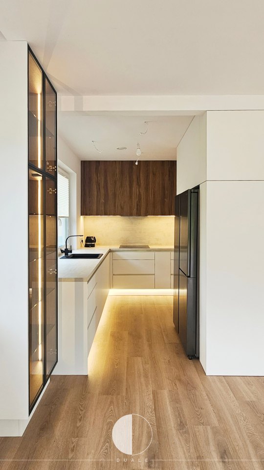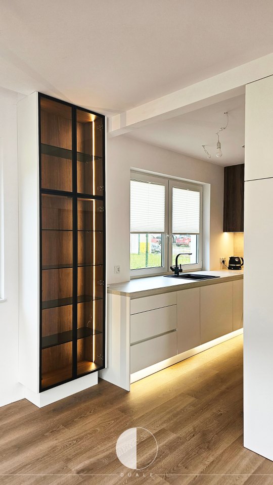 Wybraliśmy proste białe fronty, ale takie z powłoką antifingerprint, czyli niepozwalającej na powstawanie odcisków palców. Miało być nowocześnie, więc chcieliśmy uniknąć klasycznych uchwytów i wybraliśmy uchwyty korytkowe. Smaczkiem tej kuchni są ryflowane drewniane fronty szafek górnych, które dodają kontrastu i ciepłego wyrazu wnętrzu. Bardzo fajnie prezentuje się także witryna z frontami w ramce, która także jest wypełniona ciepłym drewnem.