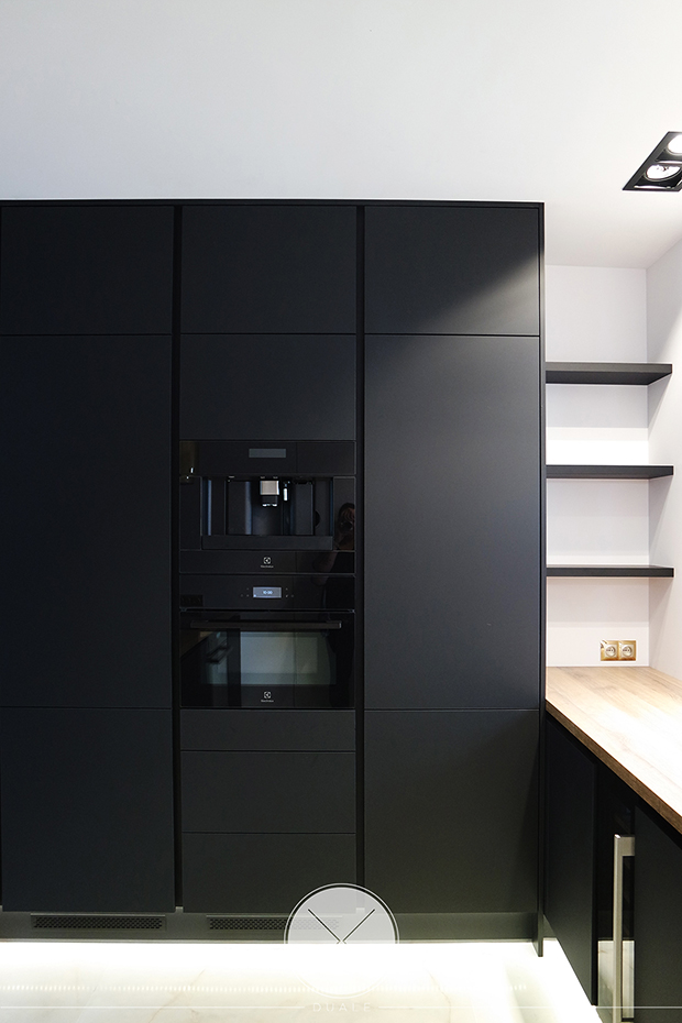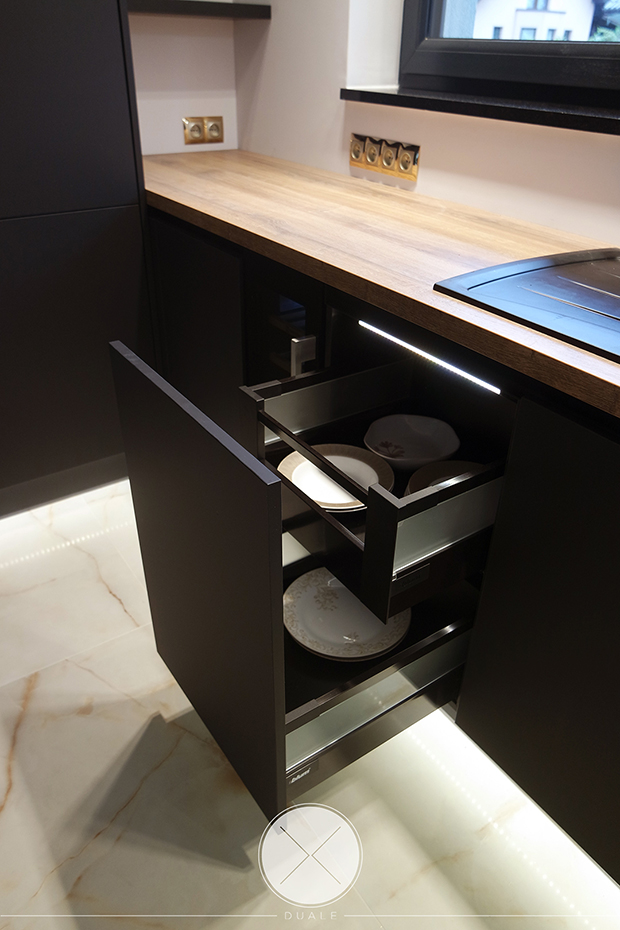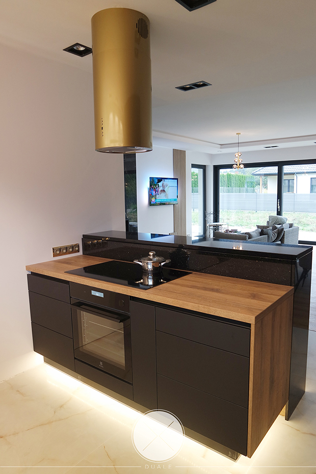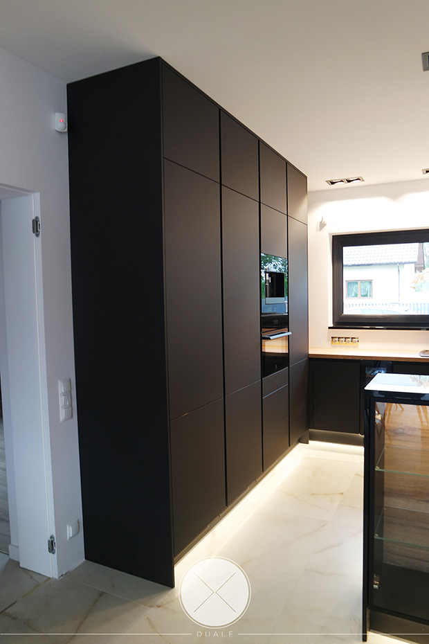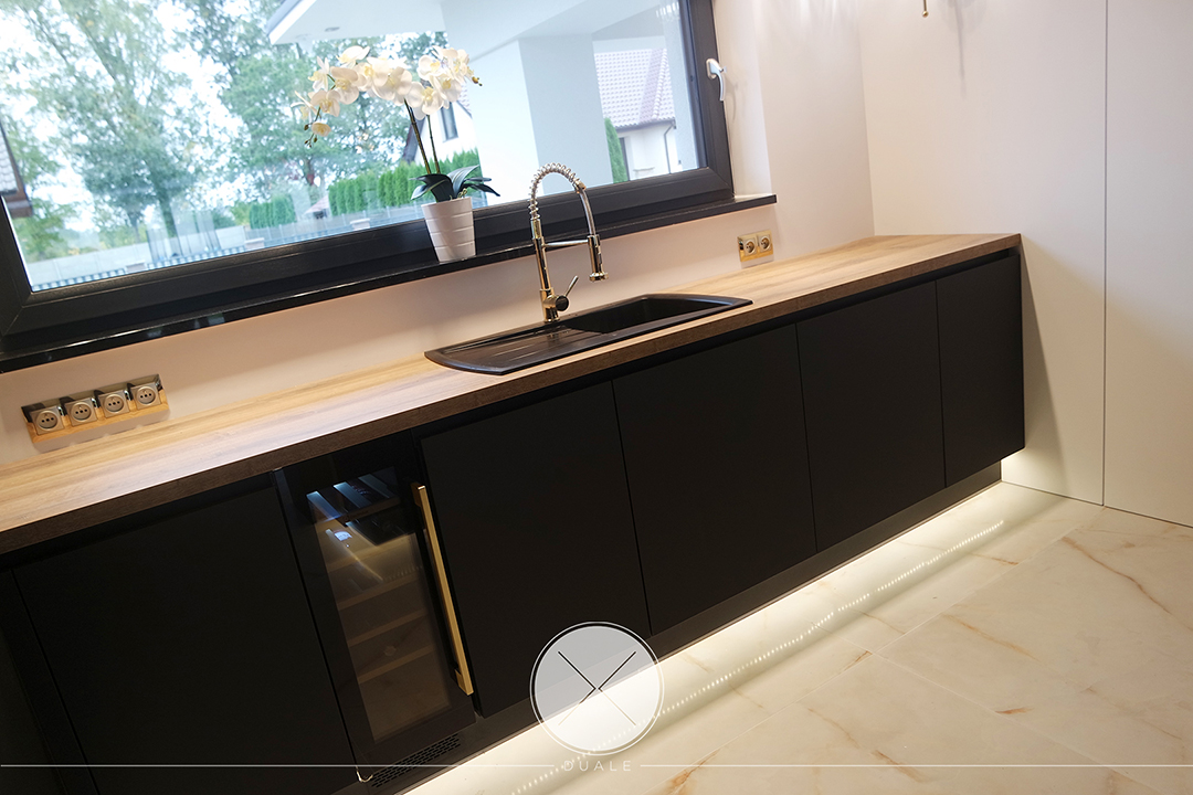Wybrałyśmy kolor czarny jako wiodący, ale koniecznie z płyty antifingerprint. Żeby ocieplić wnętrze dodałyśmy drewnopodobny blat z kolekcji Feelwood Egger. Ze względu na brak szafek górnych, podświetliłyśmy cokół i witryny, żeby do salony wpadało subtelne światło. Unikałyśmy tradycyjnych uchwytów na rzecz uchwytów korytkowych poziomych i pionowych.
