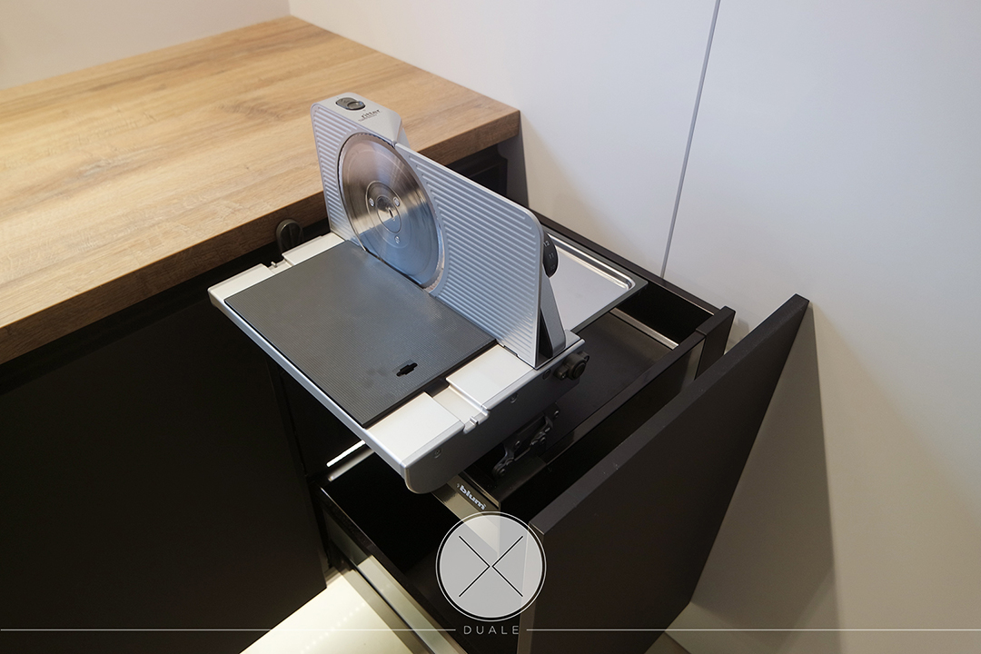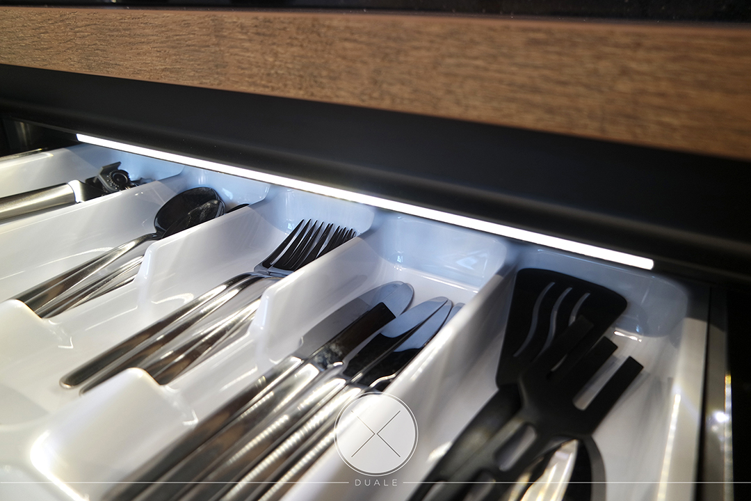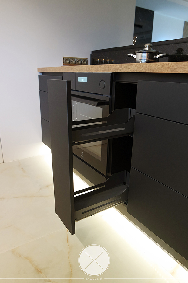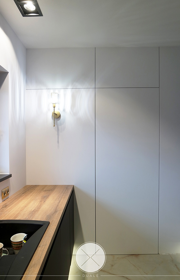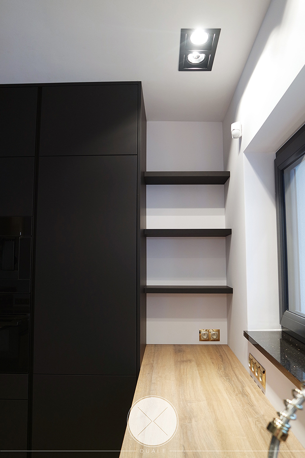 Wybrałyśmy kolor czarny jako wiodący, ale koniecznie z płyty antifingerprint. Żeby ocieplić wnętrze dodałyśmy drewnopodobny blat z kolekcji Feelwood Egger. Ze względu na brak szafek górnych, podświetliłyśmy cokół i witryny, żeby do salony wpadało subtelne światło. Unikałyśmy tradycyjnych uchwytów na rzecz uchwytów korytkowych poziomych i pionowych.