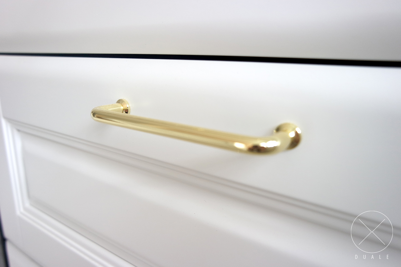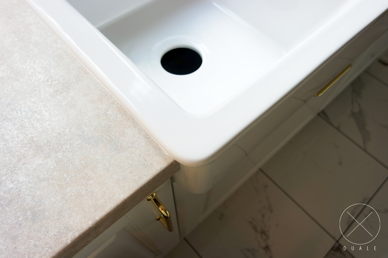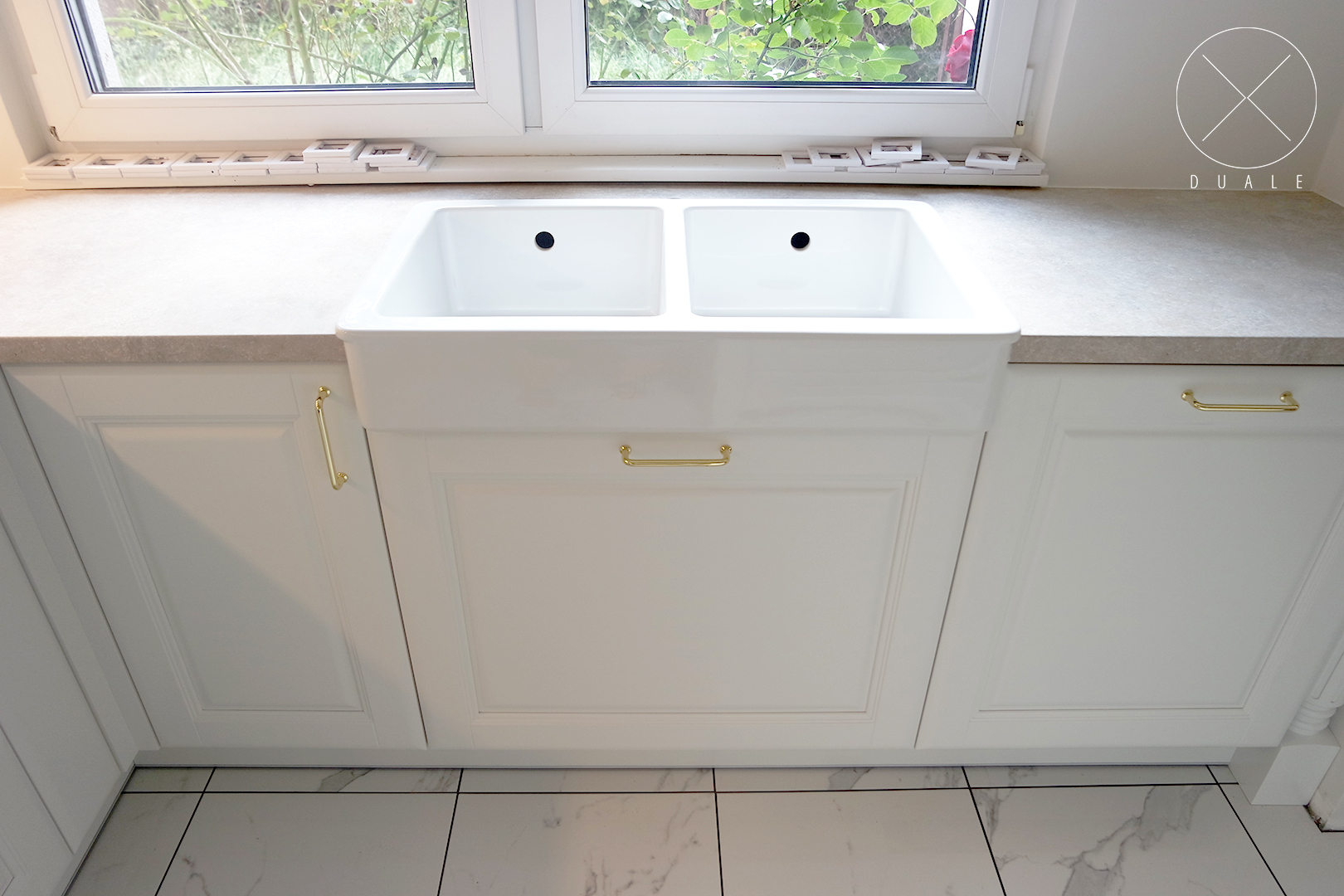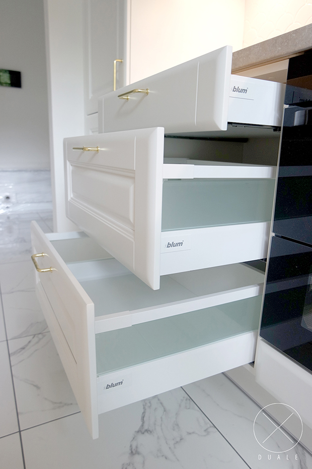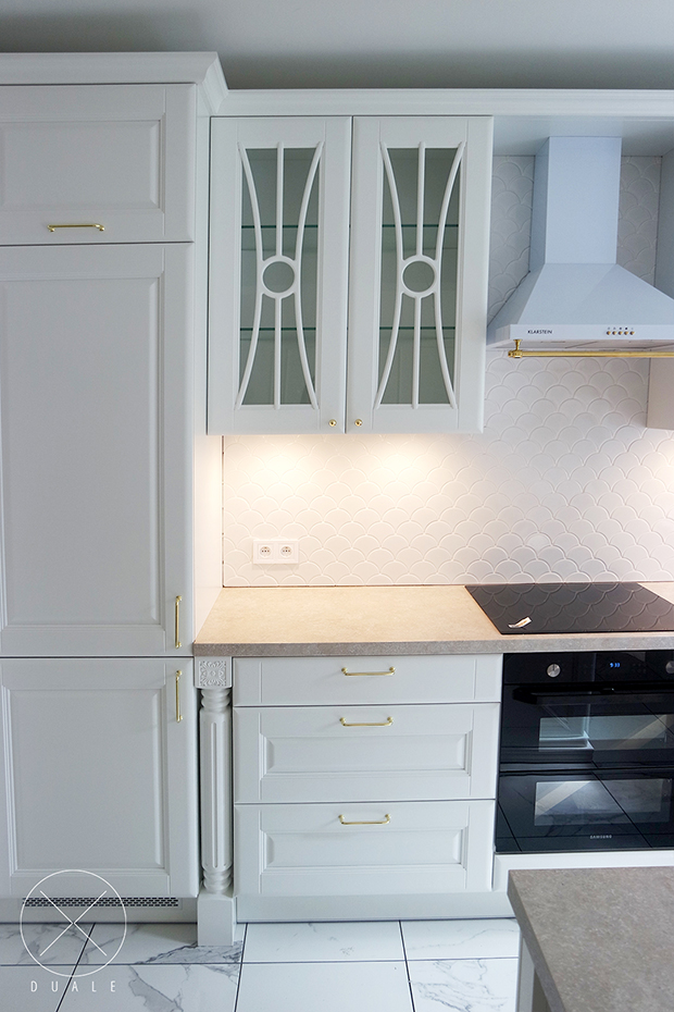 Wybrałyśmy olchowe lakierowane fronty o dosyć bogatym frezowaniu, a do nich dobrałyśmy dekoracyjne pilastry i nogi oraz wzór witryny. Dla najlepszego efektu potrzebny był farmerski zlewozmywak i stylizowany okap. Całości dopełniają złote uchwyty i blat o wzorze kamiennym.