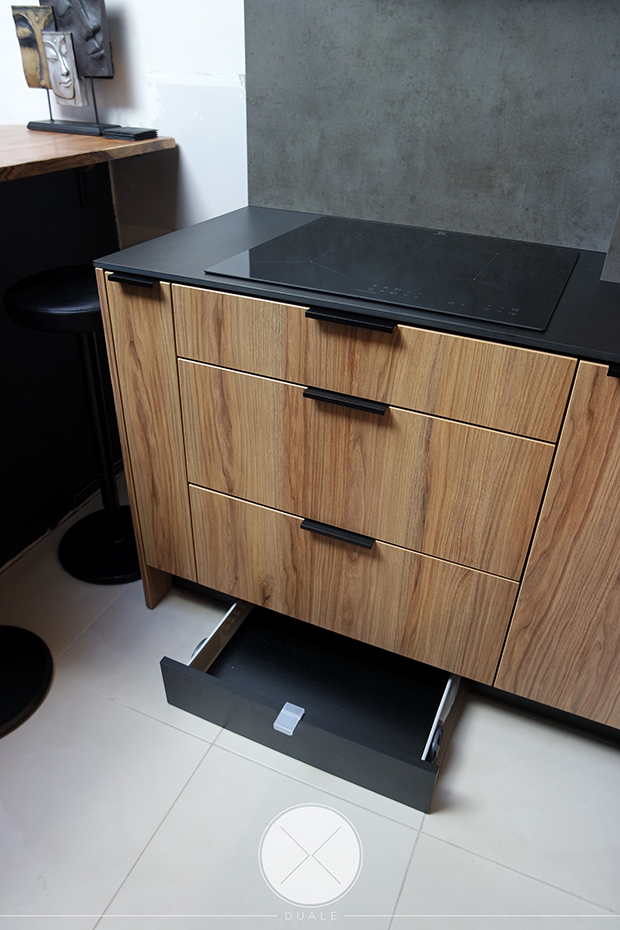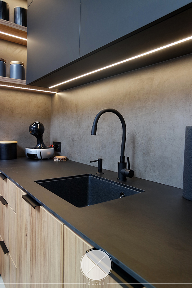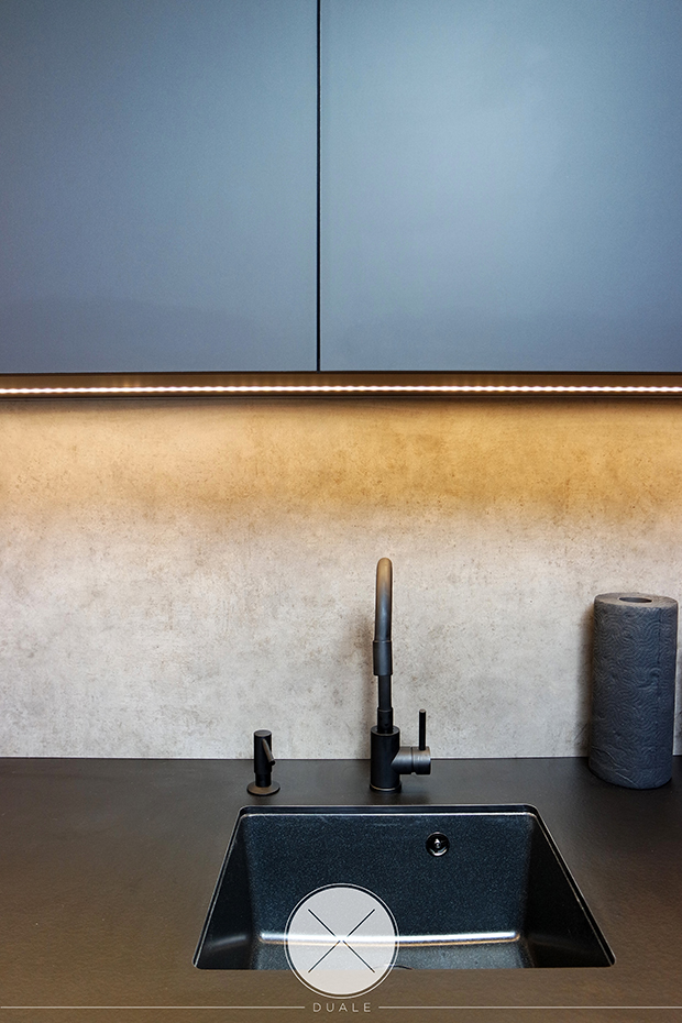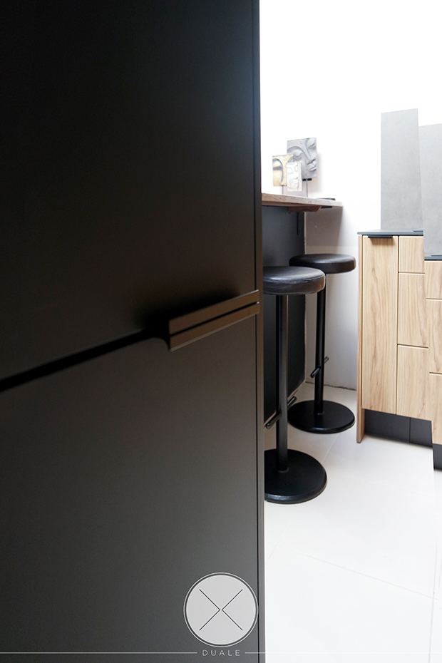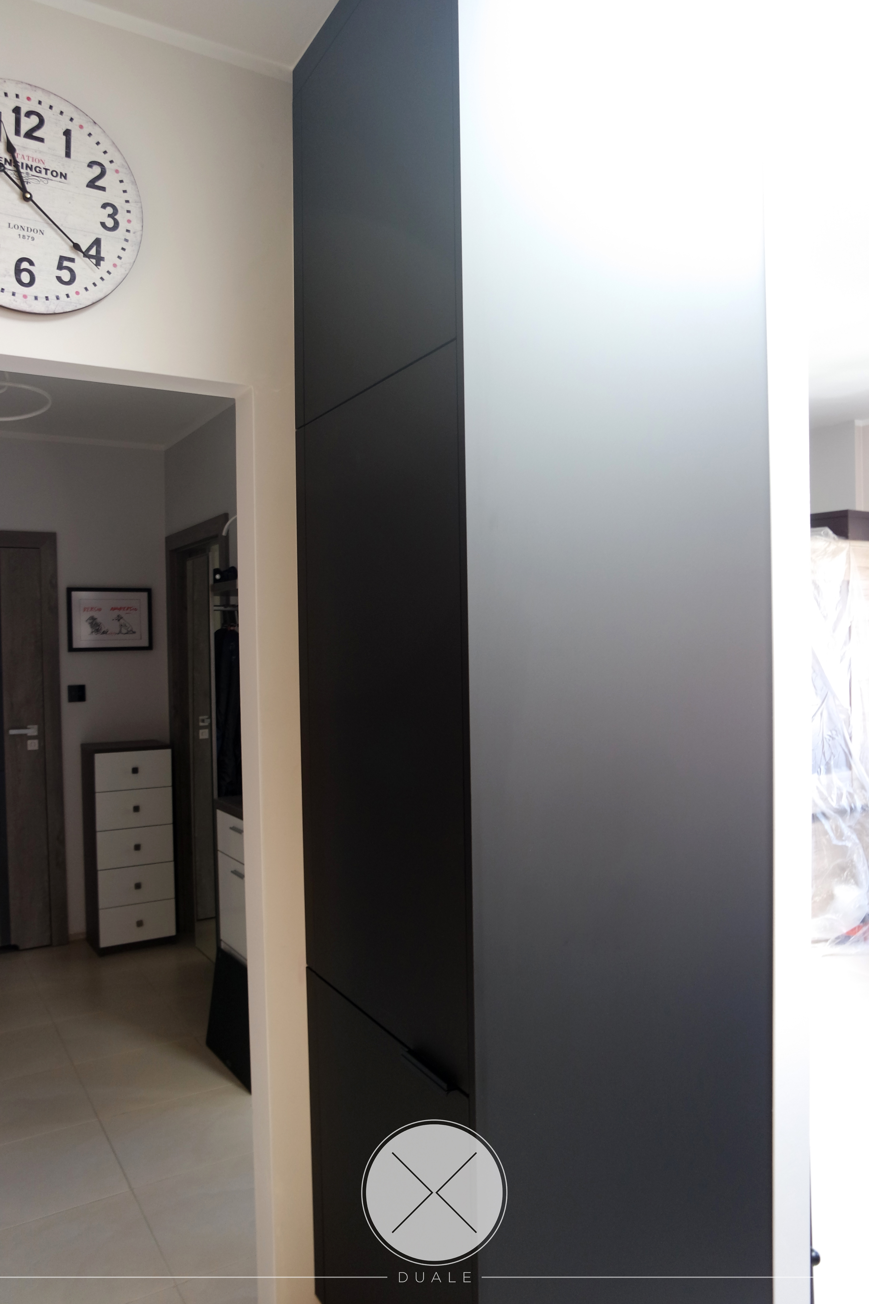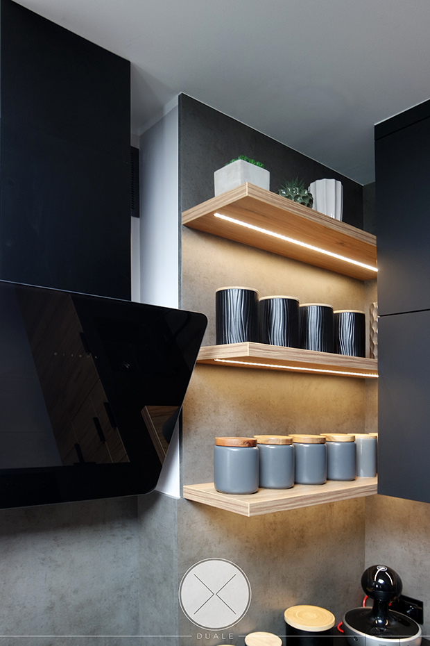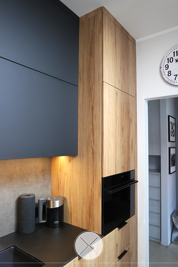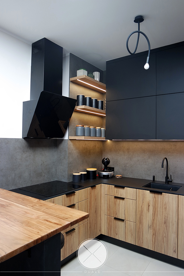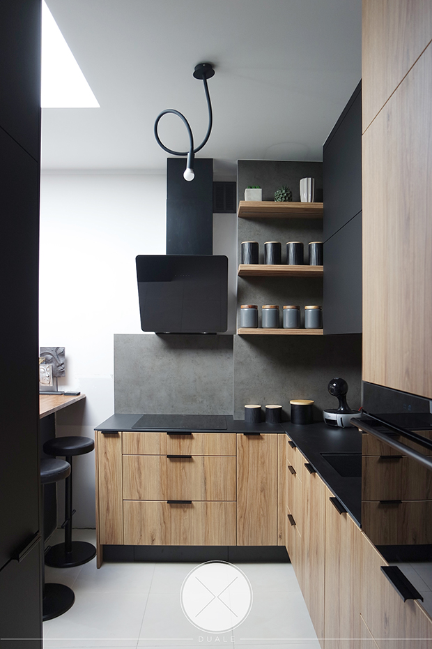 Jest to mała kuchnia na poddaszu kamienicy, częściowo otwarta na pokój dzienny. Pani Ewelina lubi styl industrialny i nie boi się ciemnych kolorów, zwłaszcza, że nad kuchnią znajduje się świetlnik dachowy. Chciała uniknąć śladów palców na frontach, a chciała uzyskać jak najwięcej miejsca do przechowywania i gotowania.