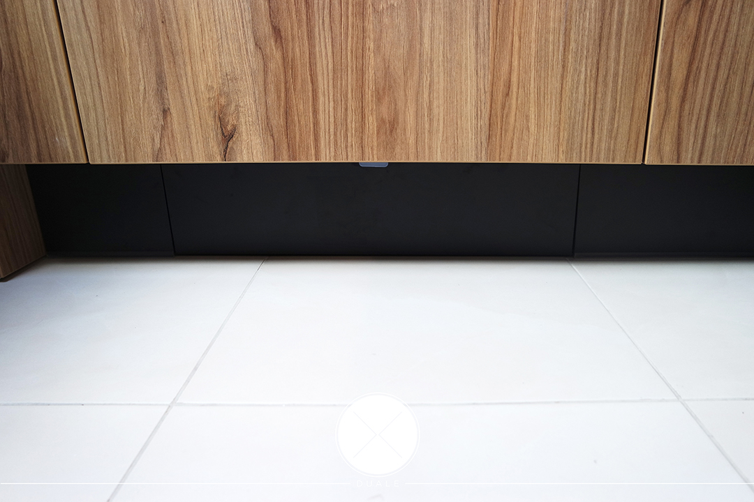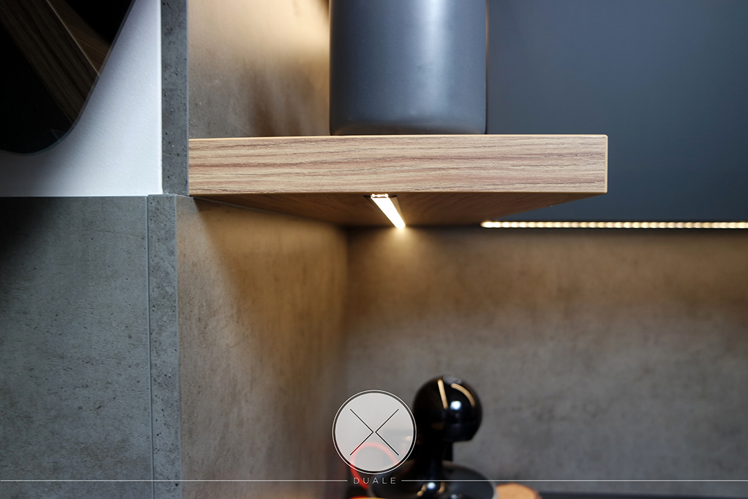 Wybrałyśmy fronty drewnopodobne do szafek dolnych, które najlepiej ukrywają drobny brud i są w przystępnej cenie. Na szafki górne i lodówkę wybrałyśmy płytę akrylową antifingerprint, a jako blat blat kompaktowy. Uznałyśmy, że płyta o wzorze betonu na ścianę będzie świetnym pomysłem.
