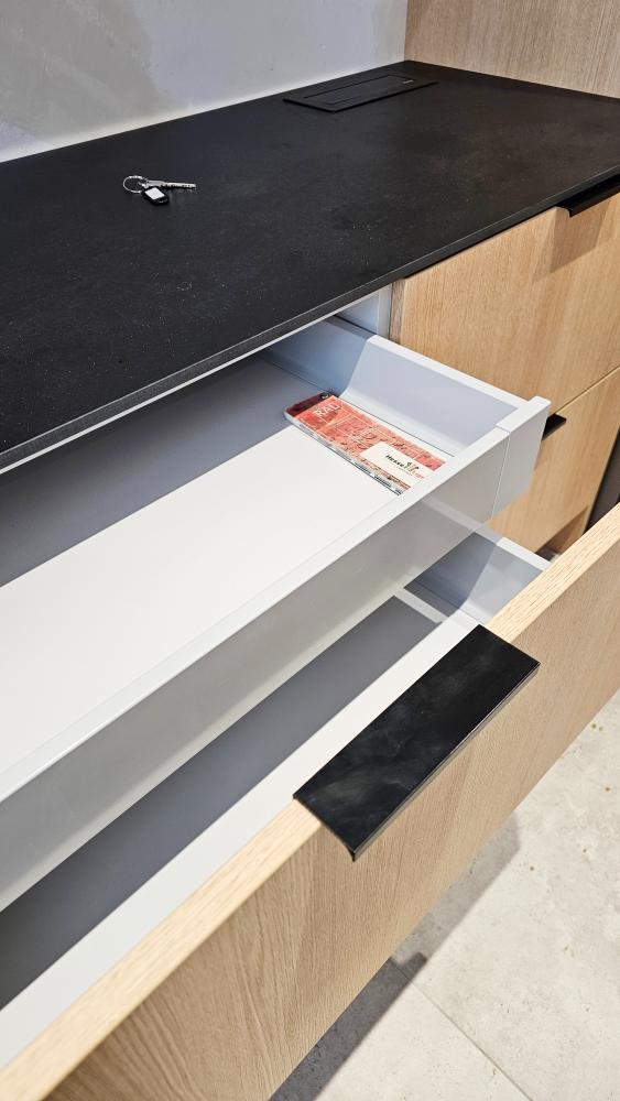 Klienci życzyli sobie, aby kuchnia była ciepła, nowoczesna i pojemna. Musi pasować do już położonej deski i płytek. Powinna mieć taki układ, żeby jednocześnie oddzielić i połączyć ją z salonem.