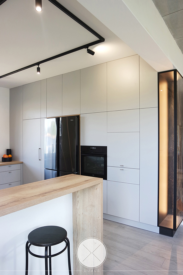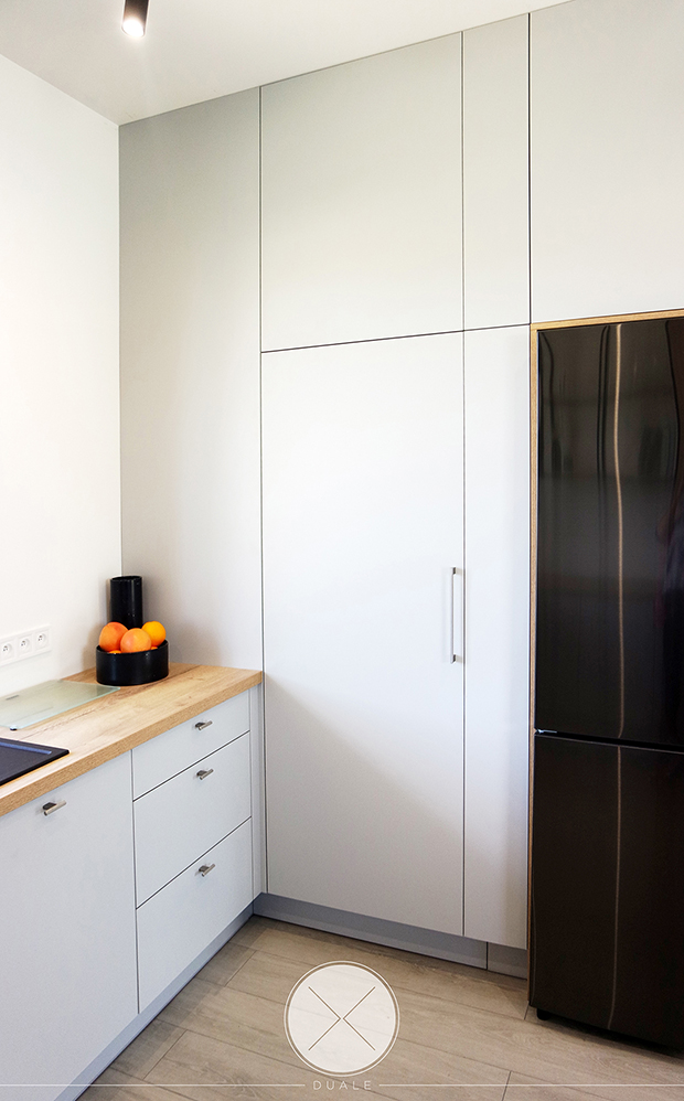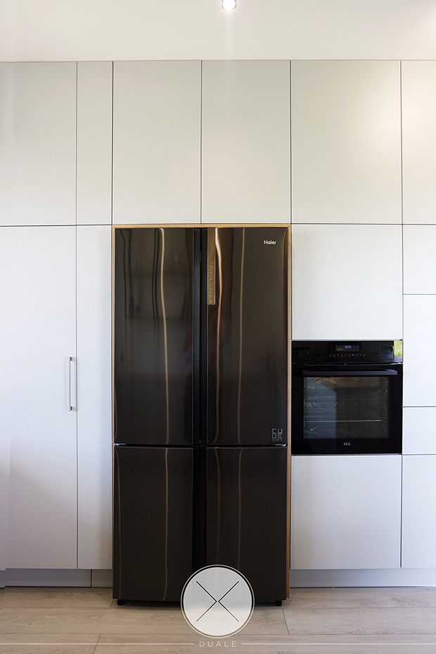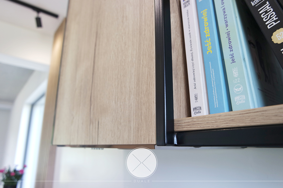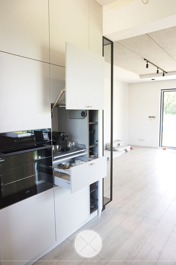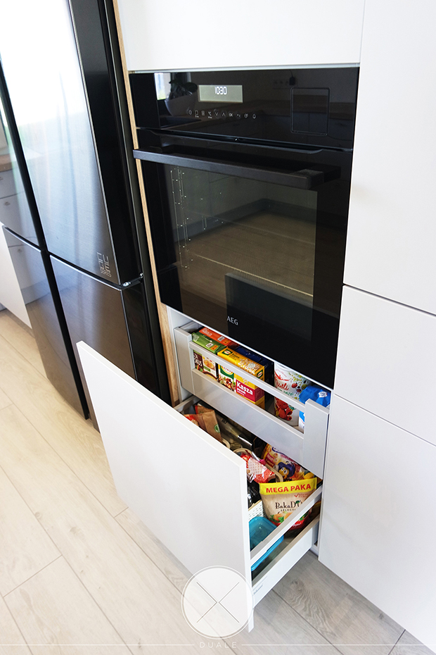 Wybrałyśmy fronty laminowane do całej kuchni oraz blat z kolekcji Feelwood od Eggera. W kuchni znalazło się dużo szuflad i ciekawych systemów, np. narożna nerka czy tacka na ekspres do kawy. Pewnym wyzwaniem było rozrysowanie drzwi do spiżarni tak, żeby z zewnątrz miały cokół jak normalny słupek.