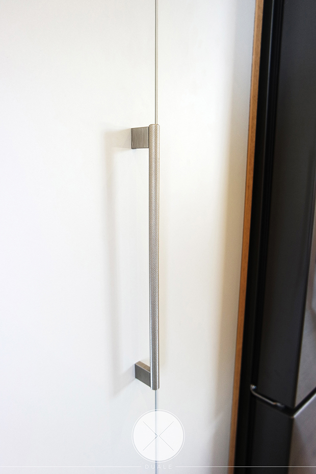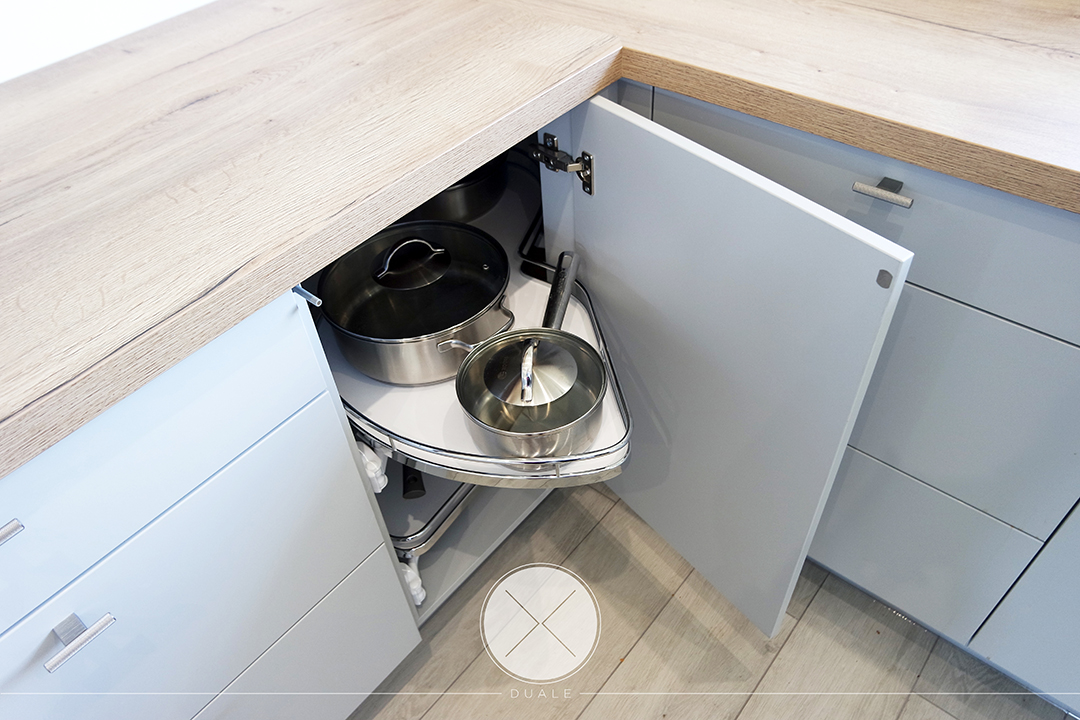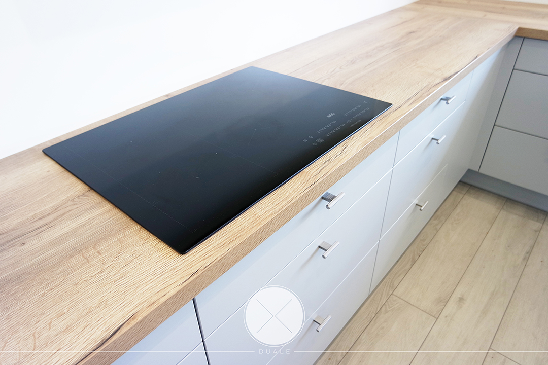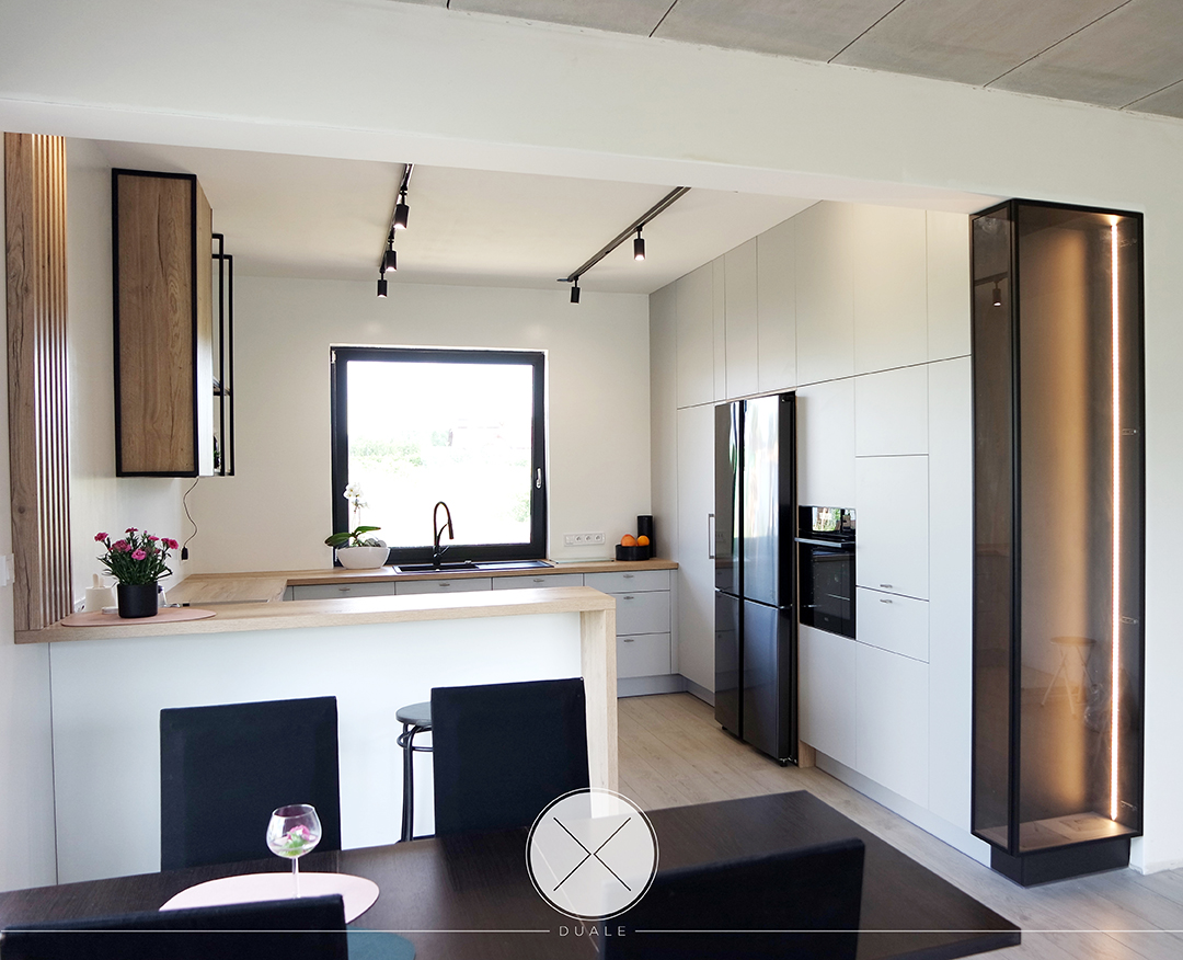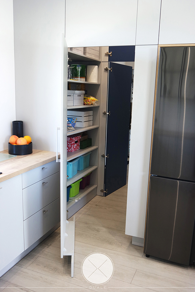 Wybrałyśmy fronty laminowane do całej kuchni oraz blat z kolekcji Feelwood od Eggera. W kuchni znalazło się dużo szuflad i ciekawych systemów, np. narożna nerka czy tacka na ekspres do kawy. Pewnym wyzwaniem było rozrysowanie drzwi do spiżarni tak, żeby z zewnątrz miały cokół jak normalny słupek.