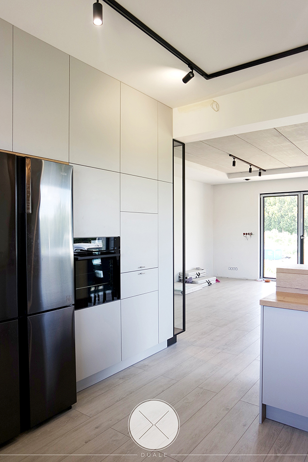 Pani Paulina na etapie budowy zaplanowała, że między kuchnią a wiatrołapem nie będzie ściany, ale zabudowa meblowa, która z jednej strony będzie słupkami w kuchni, a z drugiej szafą na ubrania. Przy drzwiach natomiast będzie znajdować się przechodnia spiżarnia. Kuchnia ma być w szarościach z dodatkiem drewna.